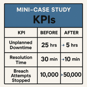 Block with before/after KPIs (unplanned downtime, resolution time, breach attempts stopped)